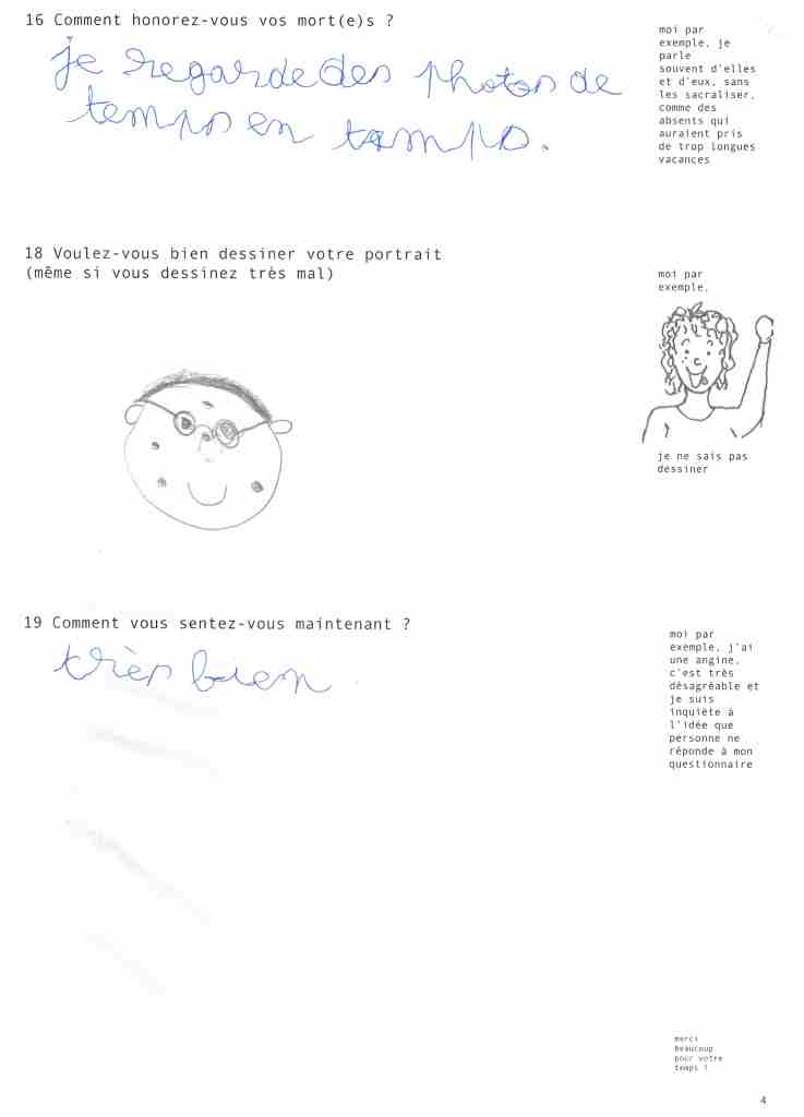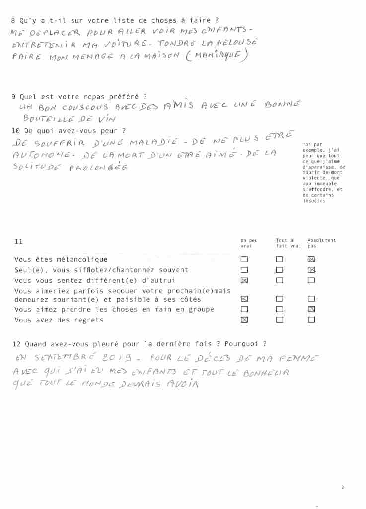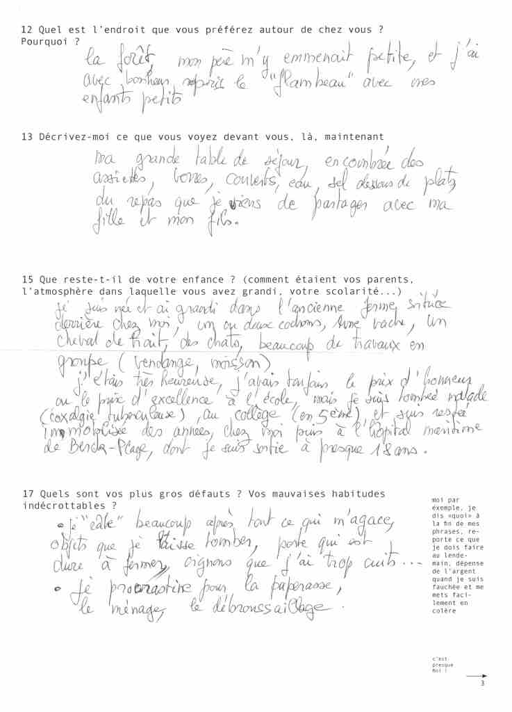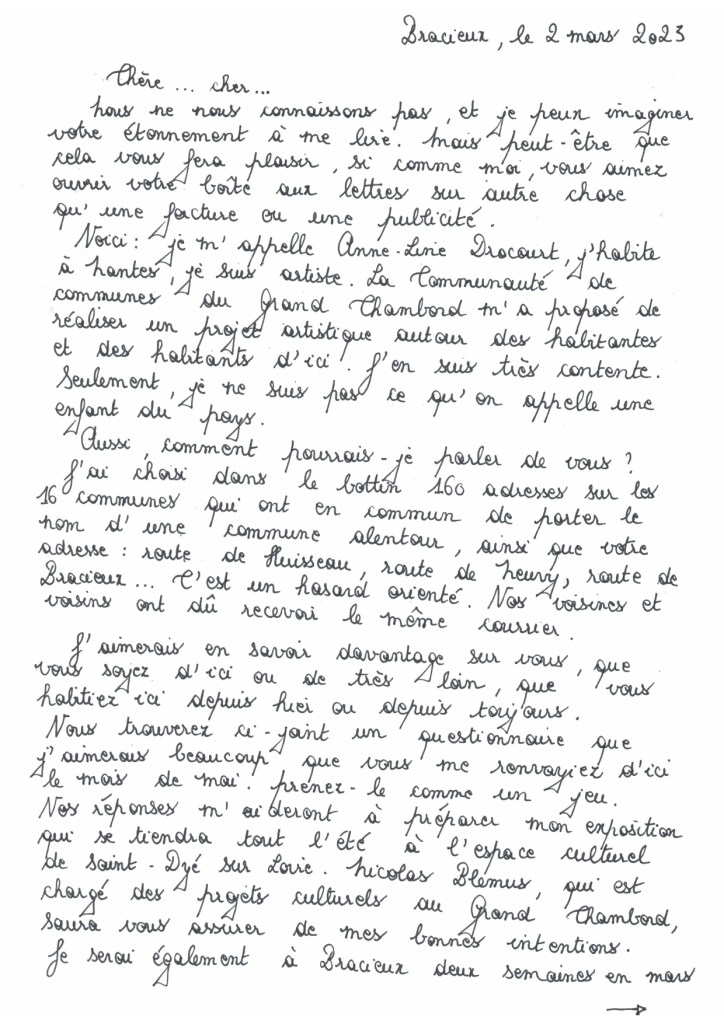 « De quoi avez-vous peur ? Êtes-vous mélancolique ? Que reste-t-il de votre enfance ? […] Au questionnaire de « vie courante » qu’Anne-Line Drocourt envoie à 160 inconnu.e.s du bottin habitant les villages tout autour de Chambord, elle reçoit des réponses. À partir de cette somme de petits hasards rapportés et de mythologies modestes, l’artiste constitue une analyse versatile, suivant une méthodologie irrationnelle, entre aveu d’incapacité à rendre compte de ce territoire et connivence anecdotique avec ceux qui y vivent. »